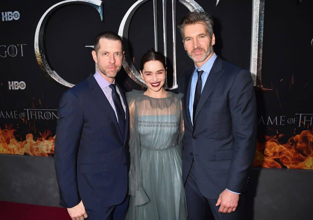 D.B. Weiss, Emilia Clarke et David Benioff à la première de la saison 8 de Game of Thrones | Jeff Kravitz/FilmMagic pour HBO